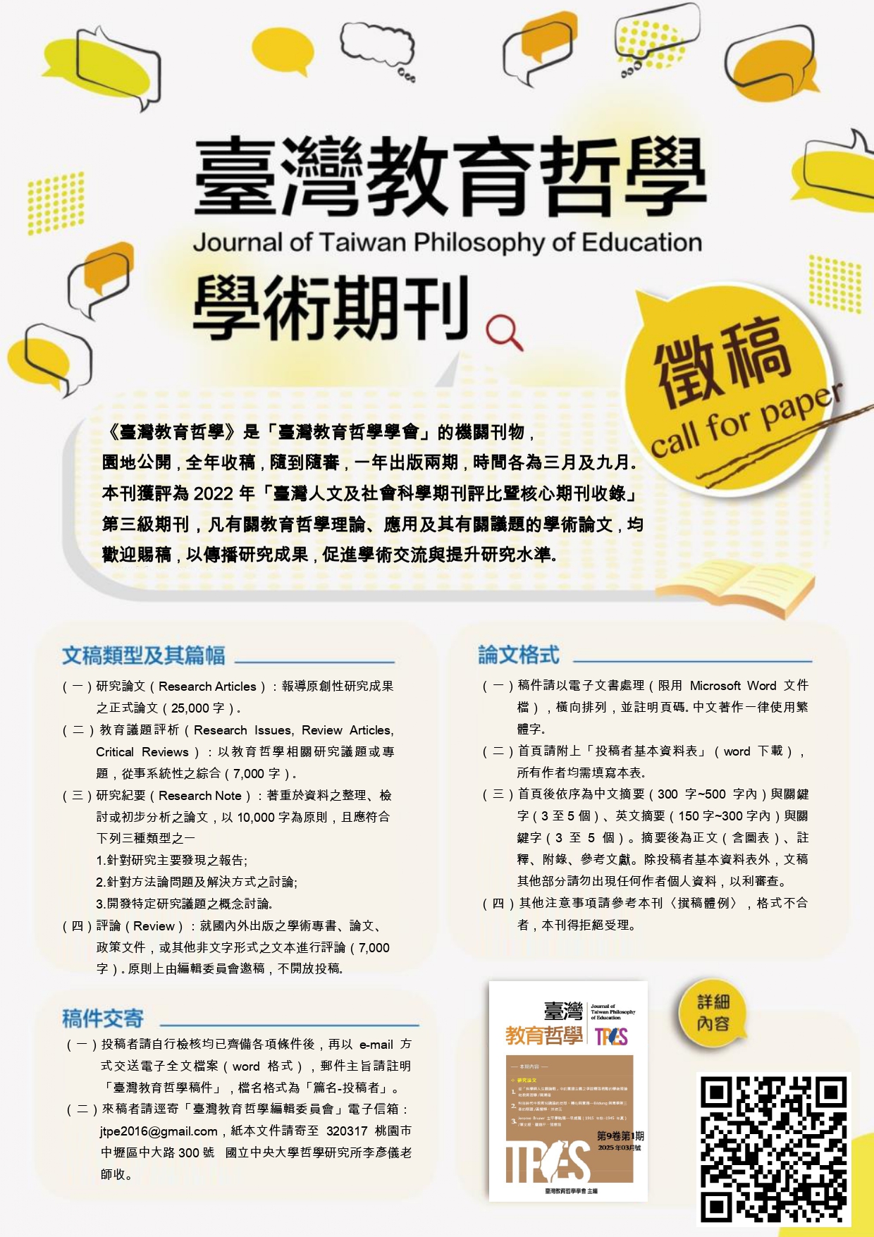 本刊為「臺灣教育哲學學會」機關刊物,園地公開,全年收稿,隨到隨審,一年出版兩期,時間各為三月及九月。凡有關教育哲學理論、應用及其有關議題的學術論文,均歡迎賜稿,以傳播研究成果,促進學術交流與提升研究水準。